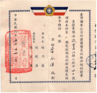 爸爸在台糖公司期間,以軍中政工經歷,多次兼任民防隊、防護團、兵役協會以及後備動員業務,也奉召接受戰地政務訓練。