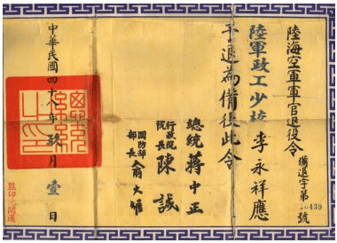 民國48年7月行政院發布「陸海空軍無軍職軍官處理辦法」,9月爸爸領到「陸海空軍軍官退役令」,以「陸軍政工少校」階級退役轉為備役,只有幾百元的退役金還分好幾年發給。
